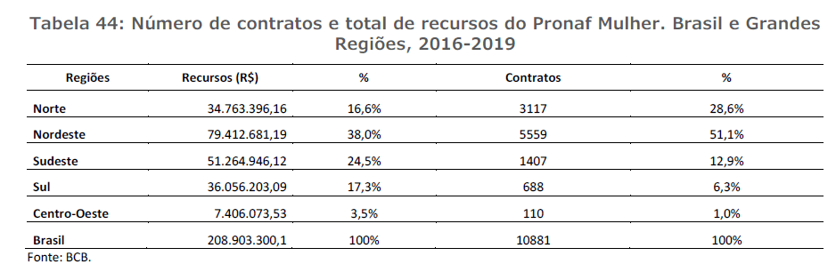 Na busca por dados mais precisos de quantidade de contratos requeridos pelas mulheres, algumas informações constam no Relatório de Avaliação Nacional de Fortalecimento da Agricultura Familiar do Conselho de monitoramento e avaliações de Políticas Públicas, Comitê de Monitoramento e Avaliação de Subsídios da União, Coordenado pela Secretaria Federal de Controle Interno/Controladoria-Geral da União,https://www.gov.br/economia/pt-br/acesso-ainformacao/participacasocial/conselhos-e-orgaoscolegiados/cmap/, conforme tabela com o número de contratos por região do Brasil e total de recursos do Pronaf Mulher: