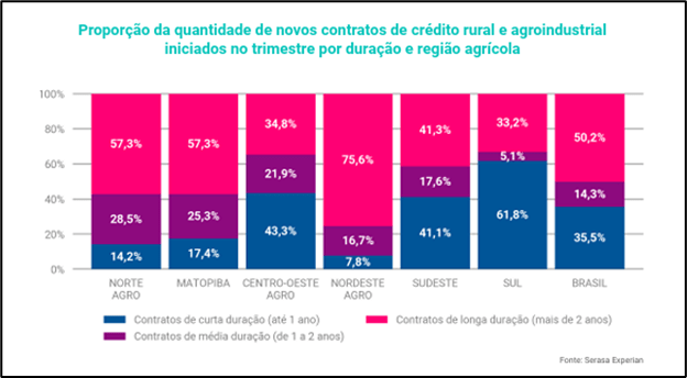 Em relação à obtenção de crédito rural, o Centro-Oeste Agro se destaca com relação aos maiores resultados para: valor por contrato (R$ 432 mil), número de contratos por CPF (1,36) e ticket médio por CPF (R$ 588 mil), mas é a região que possui contratos com a menor duração, com prazos bastante apertados: