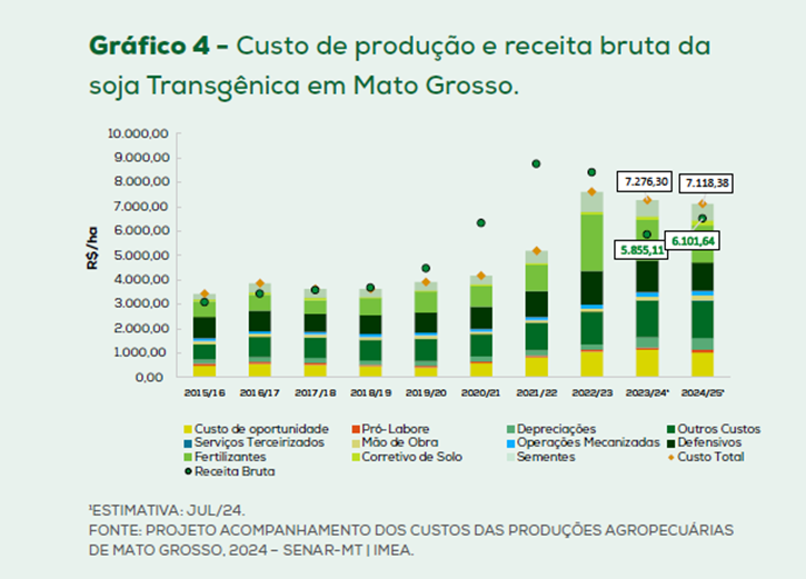 Analisando dados econômicos recentes, observa-se uma realidade alarmante: o poder de venda do produtor rural vem sofrendo uma queda constante, ao mesmo tempo em que os custos de produção aumentaram de forma significativa. Segundo o IMEA, entre 2022 e 2024, houve uma defasagem crítica entre o preço médio de venda dos grãos e o custo por hectare, resultado direto de uma combinação perversa entre a baixa nos preços das commodities agrícolas e a alta generalizada nos insumos — como fertilizantes, sementes, defensivos e combustíveis: